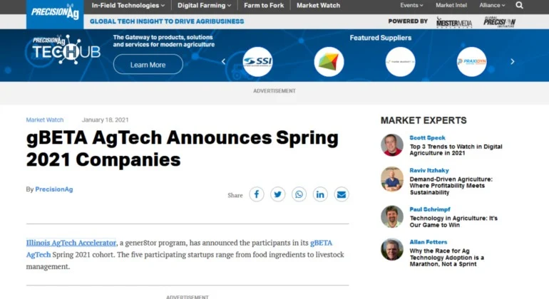 gBETA AgTech Announces Spring 2021 Companies Illinois AgTech Accelerator, a gener8tor program, has announced the participants in its gBETA AgTech Spring 2021 cohort. The five participating startups range from food ingredients to livestock management.