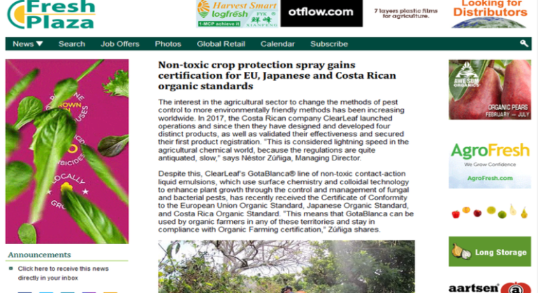 Non-toxic crop protection spray gains certification for EU, Japanese and Costa Rican organic standards The interest in the agricultural sector to change the methods of pest control to more environmentally friendly methods has been increasing worldwide. In 2017, the Costa Rican company ClearLeaf…